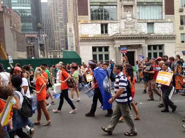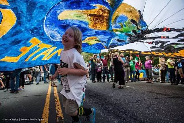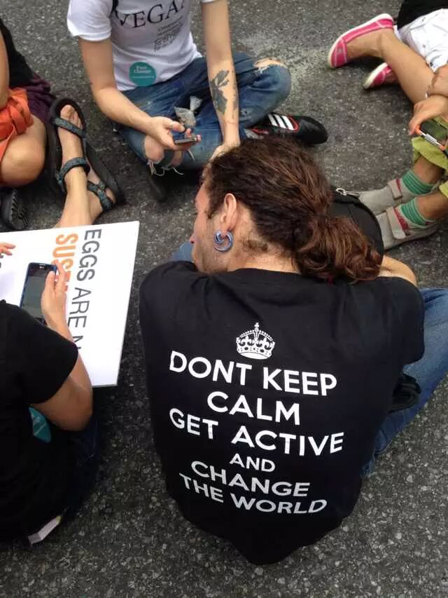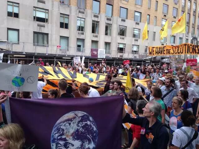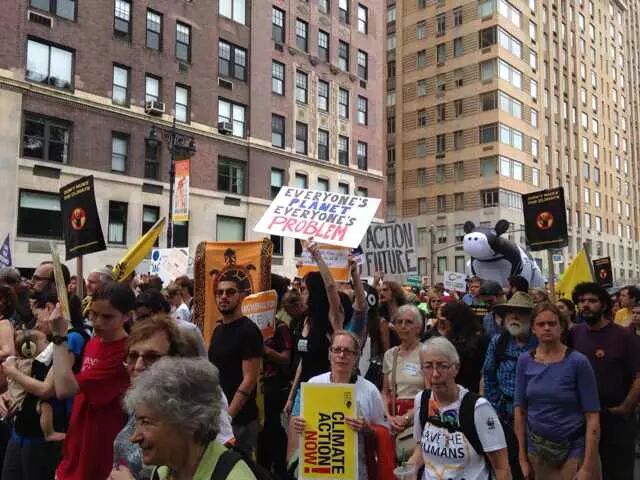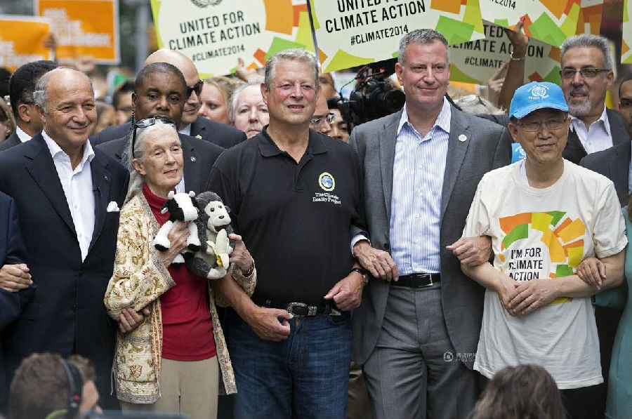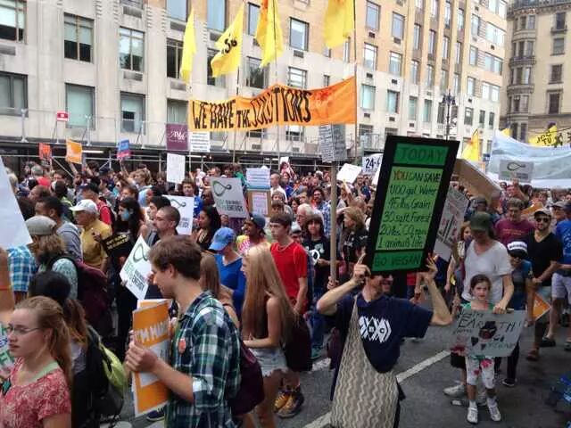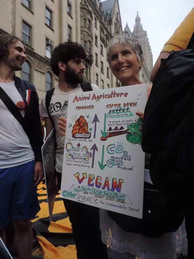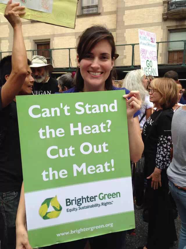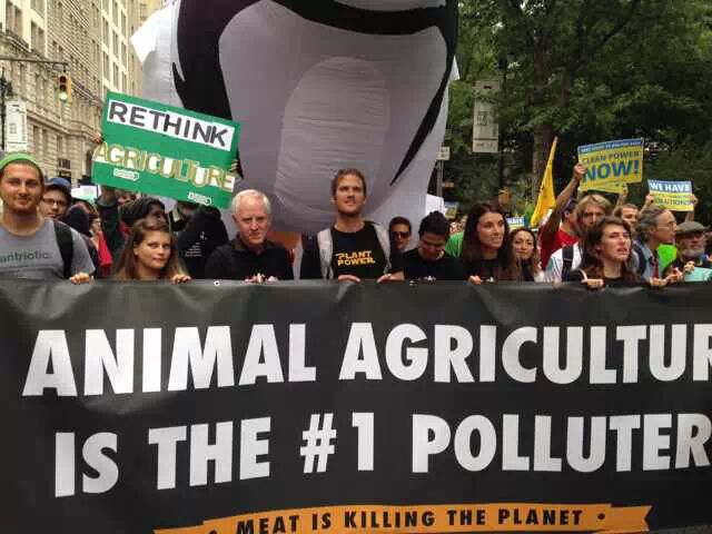 还在吃肉吗?你OUT啦! 当地时间9月21日,数十万民众在纽约展开大游行,敦促国际社会加紧应对气候变化。此次大游行是为9月23日召开的联合国气候变化峰会而举办的,获得了联合国和纽约市政府的支持,是史上最大规模的应对气候变化游行之一。 根据主办方最新数据统计,当天大游行的参与人数达到40万人,创下了历史纪录。此次游行有1500多个世界各地的组织共同组织参与,不同肤色、不同年龄、不同地域的人,为了一个共同的目标“对抗气候变化”而呼吁改变!此次游行的主要焦点是畜牧业和肉类消费对气候的影响。 纽约40万人大游行 呼吁人类吃素" title="素食风暴席卷全球 纽约40万人大游行 呼吁人类吃素" width="auto"> 在许多关注气候问题的环保人士共同努力下,9月20日晚,联合国大楼外墙当晚投影出图中的画面。“Livestockproduces more greenhouse gas than the entire transportationsector.” (畜牧业产生的温室气体比整个交通运输业还要多!)真让人振奋! 纽约40万人大游行 呼吁人类吃素" title="素食风暴席卷全球 纽约40万人大游行 呼吁人类吃素" width="auto"> 纽约40万人大游行 呼吁人类吃素" title="素食风暴席卷全球 纽约40万人大游行 呼吁人类吃素" width="auto"> 为了唤起各阶层的广泛关注,联合国秘书长潘基文(右一)、纽约市长白思豪(右二)、法国外长法比尤斯(左一)、美国前副总统戈尔(右三)、著名生物学家珍妮·古道尔(左二)等众多国际名流也参与到游行的队伍中。还有莱昂纳多·迪卡普里奥、爱德华·诺顿、马克·鲁法洛、斯汀等娱乐界明星加入游行队伍。 纽约40万人大游行 呼吁人类吃素" title="素食风暴席卷全球 纽约40万人大游行 呼吁人类吃素" width="auto"> 纽约40万人大游行 呼吁人类吃素" title="素食风暴席卷全球 纽约40万人大游行 呼吁人类吃素" width="auto"> 许多年轻人在游行,要求气候公平! 昨日,主页君Hazel也在纽约气候大游行现场,和数百名素食者一起游行,现在就与您分享激动人心的历史一刻。 此次,数百名素食者联合起来,打出了“我们拥有解决方案”的标语。向民众宣告:肉食是最不可持续的生活方式。而每个关注气候变化的人,可以做的最有力的改变就是,少吃肉!(尤其是红肉) 纽约40万人大游行 呼吁人类吃素" title="素食风暴席卷全球 纽约40万人大游行 呼吁人类吃素" width="auto"> 主页君前一日与关注气候政策的美国NGO组织BrighterGreen(记录中国肉类消费和环境问题的纪录片《何以为食》就是该组织制作的),以及美国、科威特、台湾、韩国的“无肉星期一”(MeatlessMonday)组织一起相约游行。图中的标语“肉食=全球变暖”来自AWell-fed World,一个致力于解决世界饥饿和气候问题的组织。 纽约40万人大游行 呼吁人类吃素" title="素食风暴席卷全球 纽约40万人大游行 呼吁人类吃素" width="auto"> 在现场,一个素食组织向素食者们免费发放素食T恤,也有许多素食者穿着自己的印有素食标语的T恤前来游行。素食者的队伍绵延两个街区,保守估计有超过500人。左侧有人拿着标语“吃一个汉堡=60天的洗澡用水!” 纽约40万人大游行 呼吁人类吃素" title="素食风暴席卷全球 纽约40万人大游行 呼吁人类吃素" width="auto"> 素食者队伍的最前方打着非常醒目的橘黄色条幅,上面写着“WeHave the Solutions"(我们有解决气候变化的方案!) 纽约40万人大游行 呼吁人类吃素" title="素食风暴席卷全球 纽约40万人大游行 呼吁人类吃素" width="auto"> 游行开始时,一只充气的大牛加入了素食者的游行队伍~环保素食者都知道,畜牧业排放的温室气体占世界总排放量的51% 纽约40万人大游行 呼吁人类吃素" title="素食风暴席卷全球 纽约40万人大游行 呼吁人类吃素" width="auto"> Everyone'sPlanet, Everyone'sProblem.地球是我们每一个人的,地球上的各种问题也是我们每一个人的。 纽约40万人大游行 呼吁人类吃素" title="素食风暴席卷全球 纽约40万人大游行 呼吁人类吃素" width="auto"> 畜牧业是地球头号污染源!重新思考农业! 纽约40万人大游行 呼吁人类吃素" title="素食风暴席卷全球 纽约40万人大游行 呼吁人类吃素" width="auto"> PETA(善待动物组织)此次打起了节约水的主题。“生产一加仑牛奶,需要1000加仑的H2O(水)”。“肉食是地球上消耗水资源最大的产业。” 纽约40万人大游行 呼吁人类吃素" title="素食风暴席卷全球 纽约40万人大游行 呼吁人类吃素" width="auto"> 吃一天素食,你可以拯救1100加仑水、45磅粮食、30平方英尺的森林、相当于20磅二氧化碳排放,以及一个动物的生命。 纽约40万人大游行 呼吁人类吃素" title="素食风暴席卷全球 纽约40万人大游行 呼吁人类吃素" width="auto"> 12:58分时,所有游行者举起手提示身后的人开始静默2分钟,2分钟后人群爆发热烈的欢呼声。游行的队伍绵延3公里,11:30游行队伍开始从中央公园西南角出发,但是因为人多,移动缓慢,位于13条街之后的我们2个小时以后(13:30分)才开始行进,据说队伍的尾巴到14:00才开始走。 纽约40万人大游行 呼吁人类吃素" title="素食风暴席卷全球 纽约40万人大游行 呼吁人类吃素" width="auto"> 等待的过程种,看到一位游行者身后的标语“Don'tKeep Calm, get active and change theworld”(不要冷静,行动起来,改变世界!) 纽约40万人大游行 呼吁人类吃素" title="素食风暴席卷全球 纽约40万人大游行 呼吁人类吃素" width="auto"> [size=+0]BrighterGreen的工作人员Caroline举起标语“忍受不了天热了吗?少