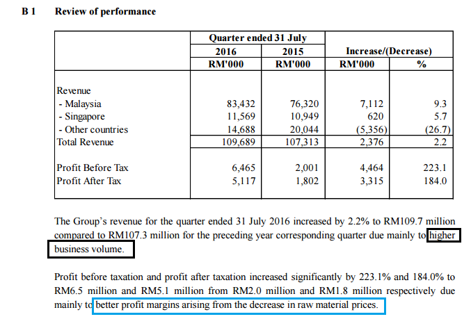 这个季度的Business volume比去年高,而且之前低价买进的原料导致Profit Margin上涨。这两样都是导致盈利走高的主因。