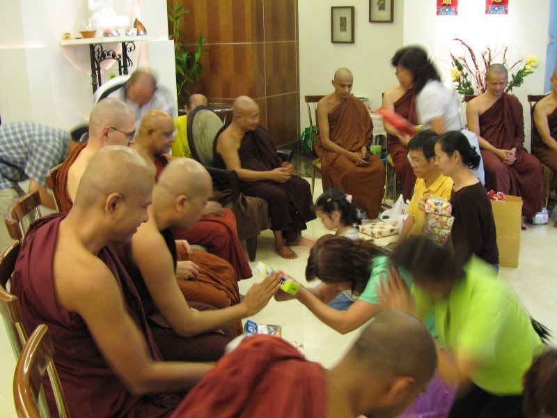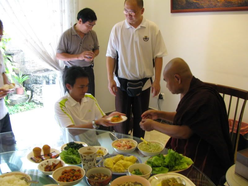 4、供养时尽可能脱掉鞋子。 由于南传出家人必须完全依赖他人的供养,所以身为一位出家人必须让自己易于护持与容易感到知足。除了生病以外,出家人是不能向非血缘的人要求合意之食,即不能要求施者一定要供养素食或者荤食,他必须能夠滿足于他人供养的任何食物。然而,若食物含有肉类,他有义务要知道是何种类之肉,因为有十种肉食是佛陀不允许的,那就是人肉、象肉、馬肉、狗肉、蛇肉、狮子肉、老虎肉、豹肉、熊肉和鬃狗肉。 为了让出家人更能专心于修道,佛陀不允许出家人处理炊事,所以不应该供养出家人未煮熟的肉、生蛋和生谷米等等需要烹饪才可进食的食物。否则,那些只依托钵方式取得一天主要口粮的出家人可要在当天挨饿了。