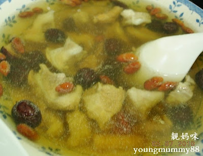 最近觉得精神很不好,很累!虽然天气反反复复的,但是还是炎热居多,所以很久没有炖药材汤了,但是今天想喝,就拿了冰箱里的一点软骨配上一些泡蔘,红枣,枸杞,当归头去炖,不敢炖得太浓,怕太苦,而且太热气,所以只是炖的淡淡的,也很不错。