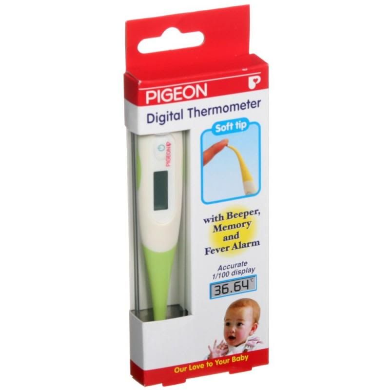 我买了PIGEON的温度计..那个温度计测到宝宝温度高发烧就会响..好像RM 30++ ..