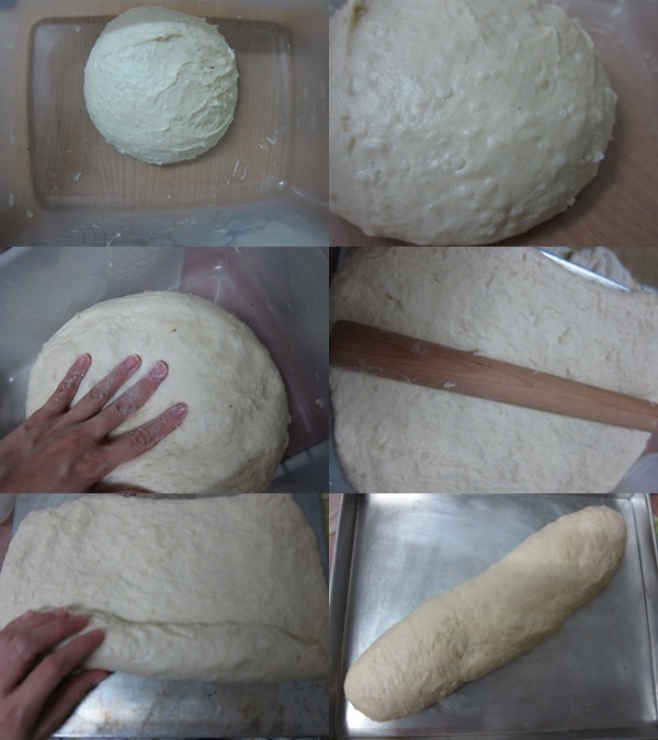 9.將麵團用桿麵棍桿成橢圓形,然後翻面,由長向捲起成橄欖形,後方收口處捏緊,收口朝下放烤盤