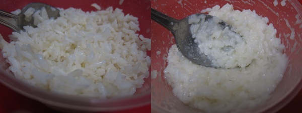 2.煮好的軟飯趁熱馬上攪拌成糊爛狀