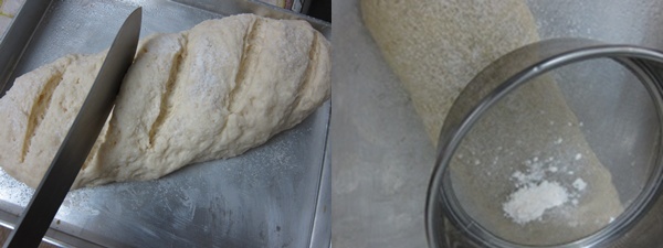 11.發酵好的麵團表面用濾網輕輕灑上一層高筋麵粉,用利刀劃3條斜線