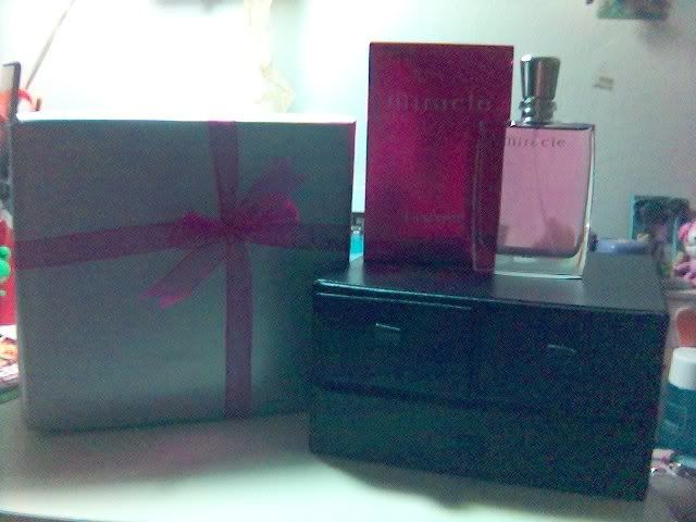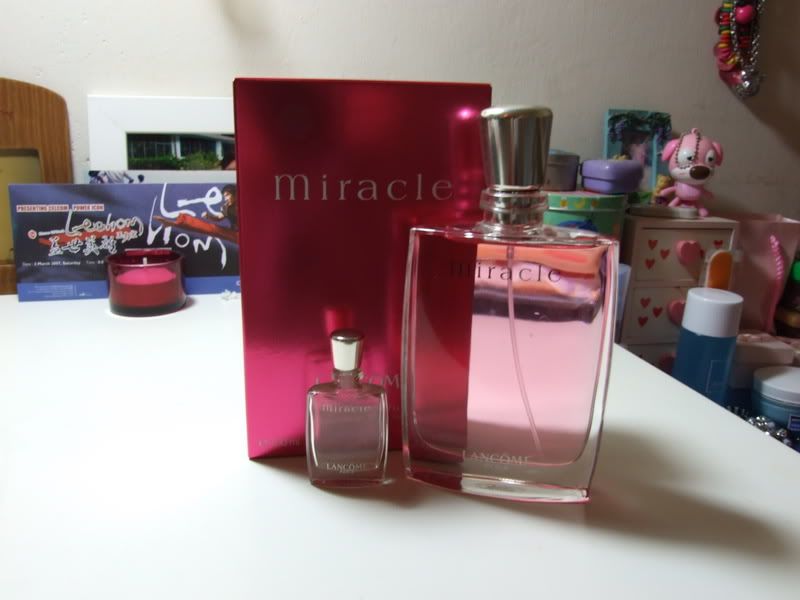 他送的 Lancome Miracle香水和我男友妹妹收的礼物一样, 也是一个漂亮的盒子装着,还有丝带帮着, 为什么我那么记得叻, 因为在我生日的前天, 我男友就带份礼物回他家, 我就问他谁送的, 他不说, 过后我就说我的生日要到了哦,假假暗示他, 他就说那边有个礼物你拿过来, 我就问是谁的, 他说他叫人在Kl买回来的, 叫我打开来看会喜欢吗? 我就打开来看,e而且是慢慢打开的那种又带着惊奇那种心情,当我打开后,一看,我也吓到怎么会是这个啊, 很贵的耶!!!他就问我会喜欢吗? 我就说那么贵也要买哦, 最后我再问他一次是送给我的吗?因为我有点不相信他会买这个, 他就笑笑说, 这个是他妹妹朋友送给他妹妹的礼物, 我听到就很生气他, 他就跟我say sorry, 说跟我玩玩吧了!!! 可是他怎么可以让我开别人的礼物啊? 他就说反正他妹妹昨天以叫他帮她开了, 没关系的, 可是我就是很气啊!!!!!  |