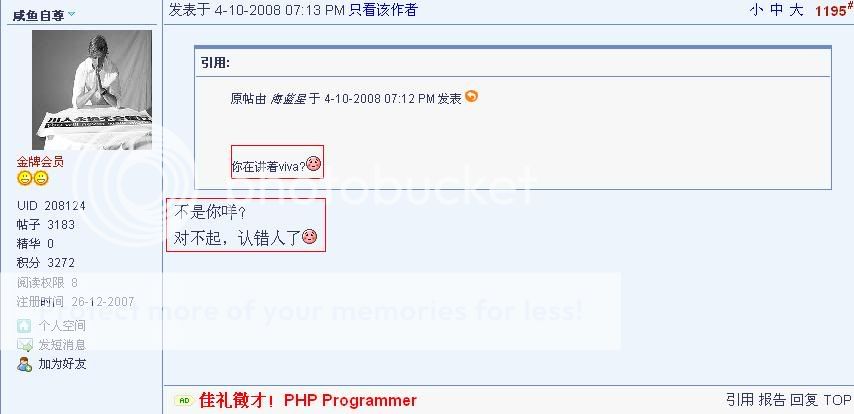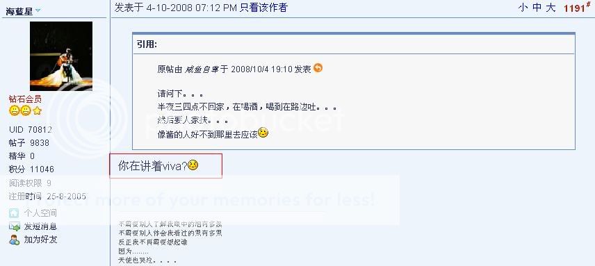 原帖由 viva_tselemon 于 4-10-2008 03:52 PM 发表 累了 昨晚没睡到 不想想酱多了 KAKI 我今晚是没节目 有事找我CALL 我 HP PLS 除了唱K~~ http://i466.photobucket.com/albums/rr30/ons0606/C0B6CECFC5A3QQB1EDC7E9C ...