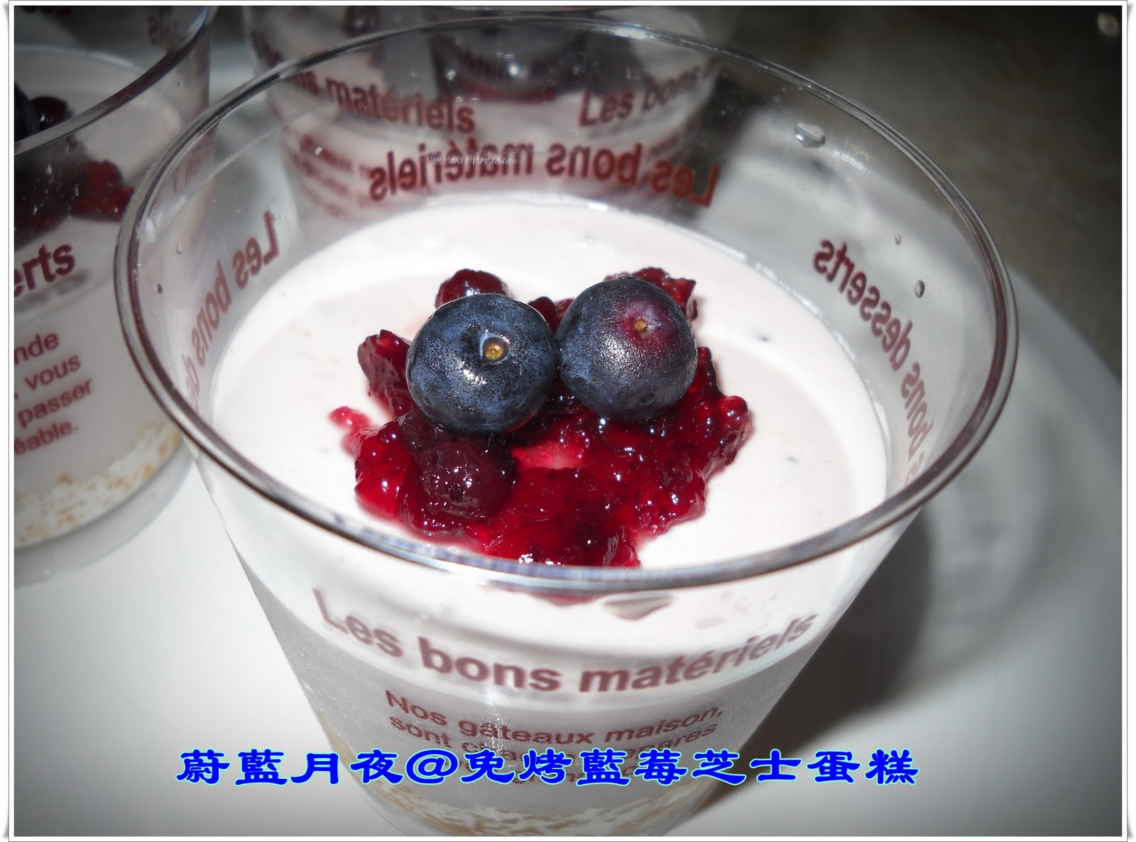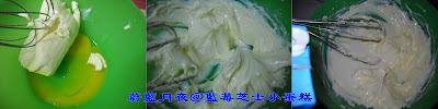1)奶油芝士加入细糖和蓝莓果酱一起拌至光滑,