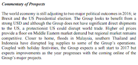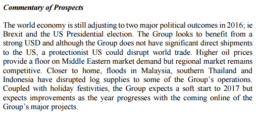 至於2017財政年盈利預測則保持不變,因為橡膠木降價、自組家具生產線投運和馬幣貶值等利好,足以抵銷產品跌價的利空。