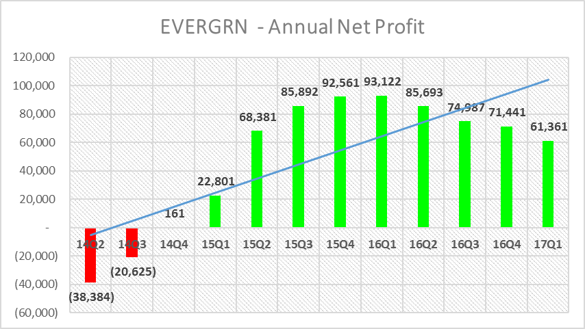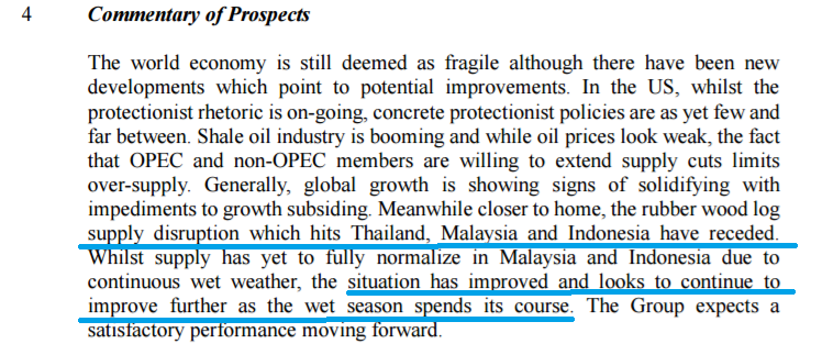 在FY17Q1,EVERGRN的盈利按年下滑约30%,是FY15以来最差的季度表现。由于去年杪和今年初的雨季导致一些地区水灾,集团的主要生产原料 – 橡胶木供应严重短缺。同时,本地的橡胶木价格也走高,拉低集团的整体赚幅。