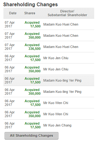 Date of change | 04 Mar 2016 | Name | MR HENRY S KUO | Age | 32 | Nationality | United States | Designation | Non Executive Director | Directorate | Non Independent and Non Executive | Type of change | Appointment | Qualifications | 1) Ph.D University of California, Berkeley (Berkeley, CA) 2) Association of Social Economics (2015 present) 3) M.Phil Princeton University (Princeton, NJ) (2013) 4) M.A. University of Illinois (Chicago, IL)Economics (2009) 5) B.Sc. Wheaton College (Wheaton, IL)Economics and Mathematics (2006) | Working experience and occupation | 1. Wheaton College : Office of Christian Outreach (Wheaton, IL) Administrative Assistant (September 2004 to December 2004) 2. EGF International Company (Wheaton, IL) General Administrative Director (June 2006 to August 2009) 3. Eleison Group (Washington, DC) Faith and Politics Summer Fellow (May 2011 to August 2011) 4. Aegis JH Veritatis, LLC (Princeton, NJ) Interim Manager (September 2010 to December 2010)Part-time Financial Strategist (January 2011 to May 2012) | Directorship of public companies (if any) | Nil | Family relationship with any director and/or major shareholder of the listed issuer | He is the grandson of Kuo Wen Chi and Hsu Mei Lan, nephew of Kuo Jen Chang, Kuo Jen Chiu and Kuo Huei Chen and brother to Justin and Jeffrey Kuo. | Any conflict of interests that he/she has with the listed issuer | Nil | Details of any interest in the securities of the listed issuer or its subsidiaries | Deemed Interest of 13,553,094 (presenting 1.60%) pursuant to Section 134 (12) (c) of the Companies Act, 1965. | Due Date for MAP | 04 Jul 2016 |