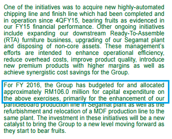 為穩住賺益,該公司在2015財政年提昇現有設施,加上採取更多自動化程序及改善效率和減少人工成本,成功轉虧為盈,管理層相信未來幾年在中密度纖維板市場穩定增長,擴展待裝傢俱業務推動下,將取得更好的盈利增長。