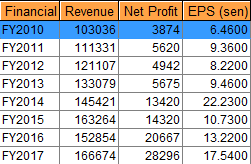 从年度业绩有一个发现,那就是该公司自2010年至今,无论在营业额和净利都已经连续7年取得增长(注:2016年营业额稍微下跌),这确实是一个相当骄人的纪录。