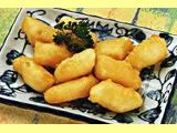 4. 將鮮奶切粒,黏上脆漿,放油內炸至金黃色,取出,隔油上碟.