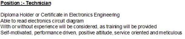 4。资格要求 : Diploma/Certificate in Electronics Engineerings