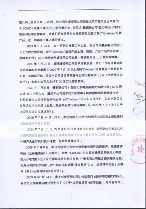 高建文先生同時還透露,2009年1月6日在北京太陽宮桑尼摩爾國際兒童城5層太山夢園商場“東方神起”三成員——金在中、樸裕千、金俊秀親自參加了“Crebeau”品牌的投資說明會,並在該說明會上向有關準備投資的各方人士介紹了“Crebeau”品牌的化妝品, 參與了睿姿麗的一系列的招商活動。同時,睿姿麗法定代表人姜翰承向北京九新公司虛假宣傳稱,“東方神起”三成員已加盟睿姿麗公司,而且還是睿姿麗公司的理事(股東),三成員將出席2009年7月16日睿姿麗在上海的“Crebeau”產品發佈會。但,“東方神起”三成員最終沒有參與該發佈會。