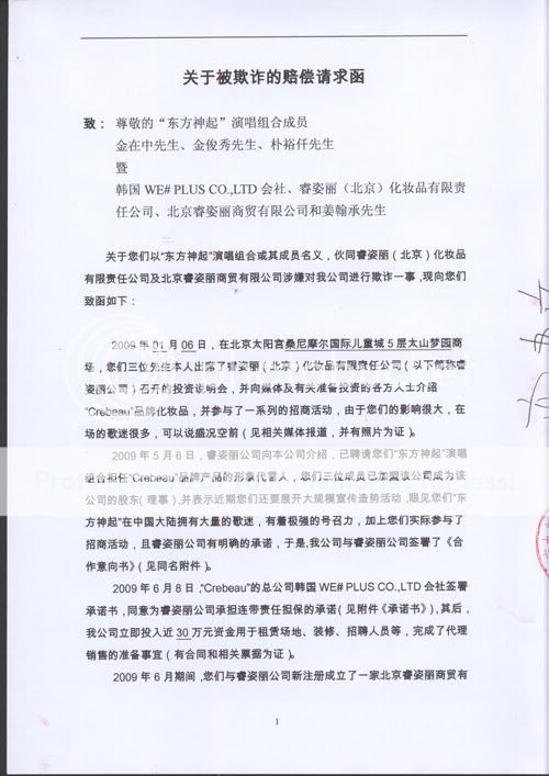 搜狐新韓線訊 據北京九新世紀文化傳播有限公司(以下簡稱“北京九新公司”)法定代表人高建文先生透露,該公司作為睿姿麗在中國上海、江蘇和陝西的總代理商,因睿姿麗虛假宣傳“東方神起”三成員——金在中、樸裕千(樸有天)、金俊秀出席其產品發佈會、並虛假宣傳將進行大規模的化妝品宣傳造勢活動等而受欺詐為由,已於2009年11月17日和11月18日分別向北京仲裁委員會和北京市海澱區人民法院提起了仲裁和訴訟,並已獲得仲裁委和法院的正式立案受理。北京市合川律師事務所陳松律師作為北京九新公司在該案中的委託代理人對此事予以證實,陳松律師出示了北京仲裁委員會出具的“仲裁案受理通知書”和北京市海澱區人民法院出具的“法院訴訟收費專用票據”。