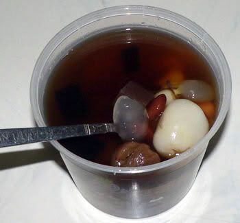 里面有莲子、白果、红毛丹+黄梨、龙眼、粉圆(台湾奶茶的珍珠)、菜燕、红豆、凉粉、海底椰、龙眼干、白木耳、冬瓜、at ...