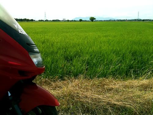 这路程从鲁乃到甲抛峇地一共24公里,从一开始的街道,河边小径,到稻田小路,除了一小段无可避免的公路外,全程都避开了吵杂的交通工具,骑了一小时后终于到达稻田,大家也放慢了脚步,一边慢骑一边欣赏翠绿的稻田,四面环绕的稻田,拍照已经是无可避免的事情了,大伙停在一条小桥上摆首弄姿,拍了不少照片。