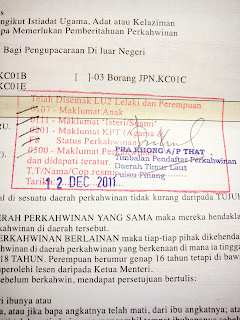同样的这次依然人潮无几,领了号码下一个就轮到我们了. 我们被上次那个官员耍了,都没需要用到正版的出生纸,害我白白错过了我想要的日子! 同样的,这边也是才花了不到10分钟,交了20大元,搞定了. 接下来就可以带到心属的会馆提交表格,选定日期就完成手续,等待大日子的到来了. 12/12/11 特别的日子看了日历,一月就只剩下14 & 15号两天方便的. 首先打个电话到德教会问看他们的注册日,刚好是我要的日子哦~还剩下4对限额吧了. 另一个檀香寺也是同样日期,不过由于地点关系,dear选择了德教会. 也由于dear不喜欢人多多,所以我和情人节集体注册无缘了.哎,我的超级纪念日啊~ 宣誓地点到了德教会,提交了表格,选了日子,给了RM50乐捐,(没有收注册费了哦)等秘书key in 进电脑后就完成了.