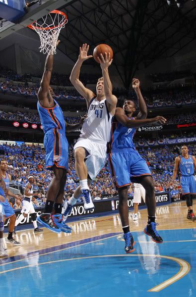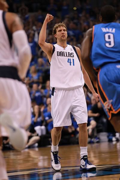 不过进入第四节之后,诺维茨基体力似乎有些问题,第一次突破皮球被科里森拍掉,而此后他的打板跳投又涮筐而出。不过诺维茨基并没有就此而下场休息,就在雷霆打出12-0并且将比分 扳平之后,诺维茨基又在伊巴卡身上打成2+1。末节后半段,他又连续利用经验制造对手犯规,利用发球得分,甚至还制造了伊巴卡的第六次犯规,将后者打下场。但他此后连续两次篮下出手 都未能命中,终场前38.8秒,他罚球线附近的出手再次未能得手,虽然此后曾两罚全中,但是为时已晚,他已不能像上赛季对上热火那样力挽狂澜,小牛不得不在主场接受失败的结局。(搜狐体育 翊冲) |