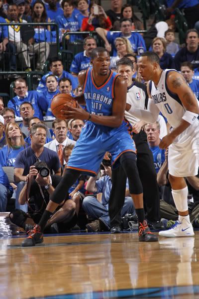 上半场防守杜兰特,小牛的策略分为三部分。第一,减少杜兰特接球;第二,杜兰特接球后绝不让他轻易投篮;第三,杜兰特突破时弱侧球员必须包夹。第二节,杜兰特接球的位置距离三分线至少有1米远,此后杜兰特持球横向推进并向篮下突破,小牛一共有三名球员上前包夹,尽管杜兰特最终还是将皮球踉踉跄跄送进篮筐,但是杜兰特的每次得分都是像这样磕磕绊绊。