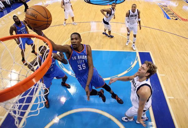 北京时间5月6日,NBA季后赛俄克拉荷马城雷霆客场以103-97逆转达拉斯小牛,以总比分4-0淘汰对手,闯进半决赛。前三节一直被小牛掐住咽喉的杜兰特在第四节得到了全场23分中的8分,其中两记三分球更是将小牛直接推下了深渊。