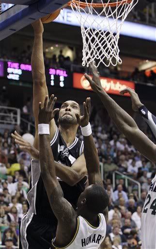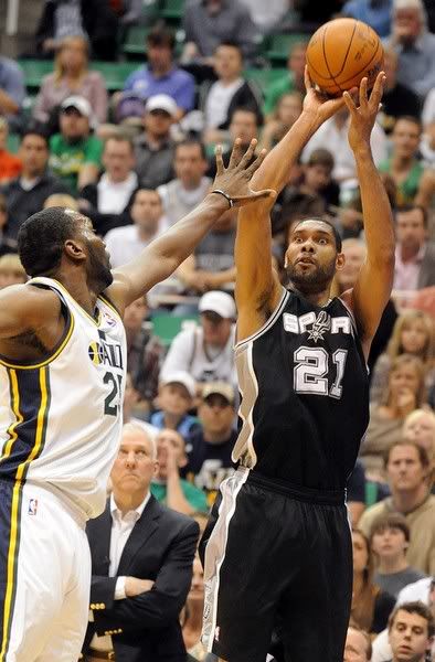 正当爵士内线跃跃欲试要打一场翻身仗的时候,邓肯开场就给了对手一个下马威。开场第一次进攻,邓肯面对杰弗森果断跳投打板命中还造成后者的犯规,加罚不进后自己又抢下了进攻篮板后再起又造成犯规并两罚全中,回头邓肯又跳投命中,马刺开场前6分全由邓肯所得。而爵士这边米尔萨普和杰弗森受限于身高无法在内线低位强吃,只能依靠中距离来杀伤马刺。首节邓肯一人就砍下8分,而米尔萨普和杰弗森各有5分进账。