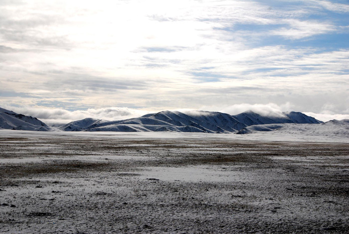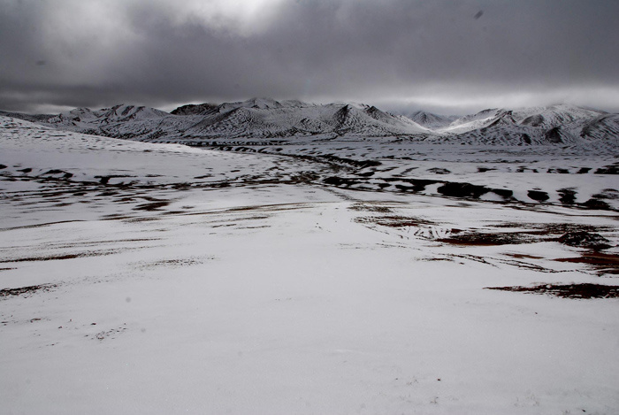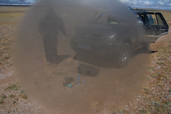 一直快到天黑,两个年轻工人中体力最好的垮下来,头发热,昏睡。天气也差,飘着阴雪,冷风,只好在车上再熬一夜。非常冷,没吃的,继续吃调料包,老头又看不惯,(弄得我吃调料包都偷偷摸摸的)。一会儿又用身体挤我,一会儿说我踩了他脚,淡定,淡定!!!心里真是抓狂啊。很理解,这种环境下人都很脆弱,他们虽在无人区里探矿,但毕竟每天有白馍肉蔬菜,有人交流,有工作时间,除了海拔不同,和一般内地工人并无太大区别。