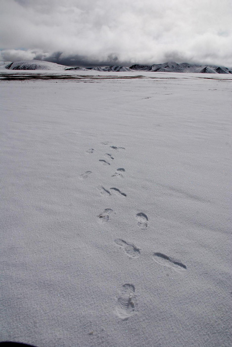 休息时间较长,起身没走几步,蓦然回头(不知道为什么要回头),见一辆越野车在身后十几米处,极缓慢的速度,没有一点声音。以为这下真幻觉了,休息这么长时间难道发现不了车接近?再看,果真是车,跑上去,敲车窗,要吃的。从司机黄哥角度看这场相遇:路中间有头牦牛,放慢车速,渐渐觉得牦牛没这么小,便是狗熊,再近,怎么狗熊还会弯腰捡东西?再近,是人!不可能啊……