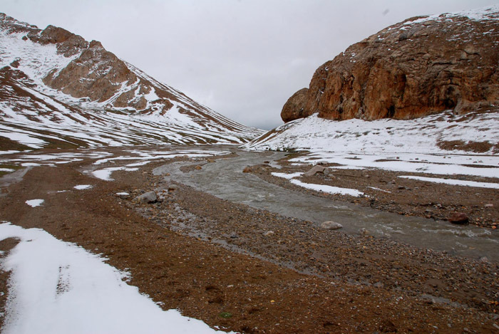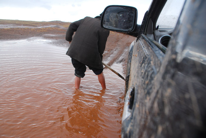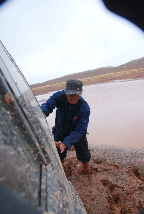 上冻,车子冲出泥坑,人徒步,车子轻装冲向山口。路太烂了,坐过墨脱的车,那是小巫(有季节因素)。一小时后候车陷死,随后用了十个小时,靠人力将车移动了八百米——难以回首的八百米。三个工人一直淌在水里挖车,挖路,我没法再吃这种苦了,只在稠密的烂泥里推车,那也是够呛。看不下去了,也撑不住了,只想安静地待在车上,等待炮车,客观上,仅凭我们几个人也没法将车弄出去,就一直劝黄哥,别折腾了。中午方便面就快没了,所谓的炮车一直不见,所以黄哥有些着急,希望车能撑过山口下到回民帐篷,所以对我的建议充耳不闻。