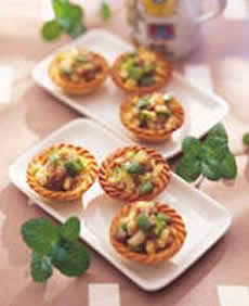 (5)將餡料平均分配到每一個酥皮塔中,依序做好12個。放入烤箱中,以180~200℃,烤約15~20分鐘,至熟後取出,小心放到盤子中即完成。 |