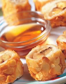 (3)油鍋先燒熱,再以中火將香蕉卷炸至金黃色即可撈起,炸好的土司可依個人喜好切片或切段,沾上蜂蜜或楓糖漿一起食用風味更佳。 |