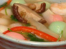 將高湯、水、榨菜絲、香菇以及油蔥酥一同煮開。倒入湯圓煮至浮起,在倒入蝦仁煮熟,起鍋前加入蔥段及香菜,並以鹽及白胡椒粉調味。 |