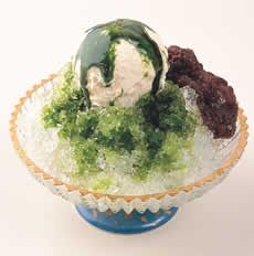 (1)在容器中先裝入適量蜜紅豆,並淋上少許抹茶糖漿,再將刨冰鋪放於上,頂端放一球香草冰淇淋,一旁再放些許紅豆泥,最後淋上抹茶糖漿、灑上一小撮抹茶粉即可。 |