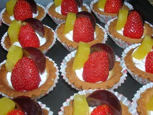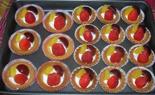 哇,好多水果塔和芝士塔。。我很喜欢哦。。你的水果塔只是先烘皮先。。。然后出来后就放一些水果之类。。??那么那个白色是鲜奶油吗。。??如不是,是什么。。??我买外面的,是带点黄色。。而且很香。。不知道是不是放了CUSTAR POWDER??