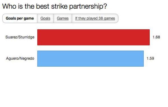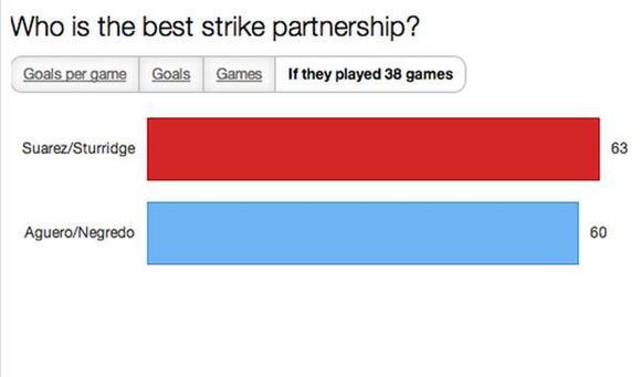 英媒根据苏神和斯图里奇同时在场的效率,假设他们38轮都联袂登场,则每场打进1.68球,整个赛季攻进63球;若阿奎罗和内格雷多同时登场并38轮全勤,他们场均进1.59球,一个赛季进60球。放眼整个赛季,利物浦的黄金双枪也要胜出。