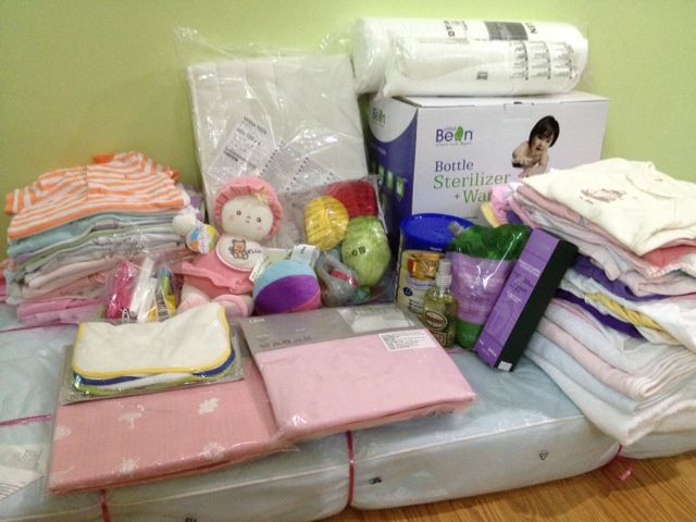 消毒器那箱上面的一个是盖被一个是枕头, 最下面蓝色的是mattress, 后面白的的是mattress protector, 前面两包粉红色的一包是床单一包是被套/枕头套, 上面那一小包是baby bib, 中间3个soft toy(除了娃娃是mum's care以外全是ikea的)