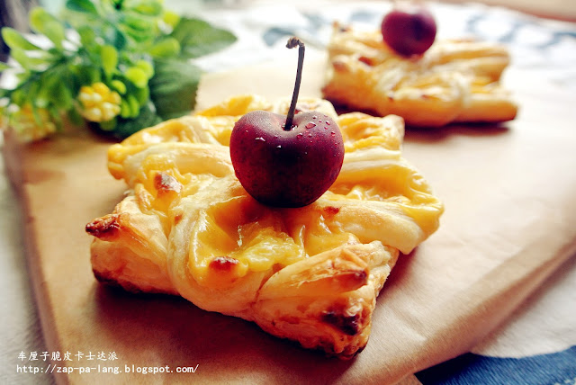 1。在解冻后的派皮中间放上1匙卡士达酱,照这个链接的教程折叠派皮。(Avatar 型折叠教程链接)