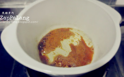 4。把3/4冰糖倒入煎过五花肉的油里, 转小火炒至冰糖融化, 当颜色转棕色后离火稍微摊凉。