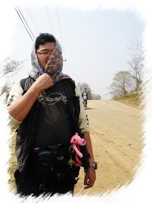 沿着长安夫妇所指示的道路约走了半个小时,我们走出了龙坡邦的市区,一路上都是灰尘滚滚的黄泥路,这个时候,之前买回来的头巾就好用了。。