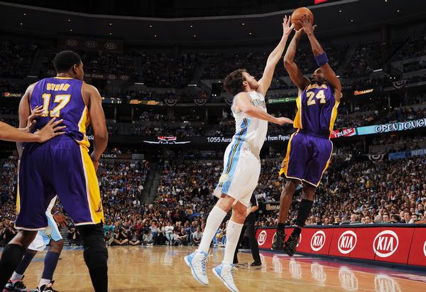 布雷克命中三分球帮助湖人反超,虽然哈灵顿连得5分,但是希尔内线发威连续抢到前场篮板球,前五分钟过去之后湖人以80-76领先了4分,此时希尔已经拿下了12分和10个篮板球的两双。掘金再次追平,拜纳姆和科比联手再度拉开,加里纳利2罚全中追到84-86,此时比赛还有3分钟整。加里纳利跳投扳平,但是随后他和加索尔相撞倒地,5打4的湖人队由塞申斯命中三分球。米勒进攻干扰球,布雷克再度命中三分球,湖人在还有18.9秒的时候以92-86领先了6分。掘金喊出暂停并进入犯规战术,最终还是以88-92的比分输给了湖人队。