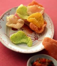 (2)把平底鍋預熱,再加入沙拉油,高度約3公分即可。油溫要高,再分兩次放入蝦片油炸。蝦片油炸時空間要足夠,因為蝦片遇熱後會膨脹,等蝦片膨脹後就可以夾起,將油瀝乾,再放入盤中,再把調好的墨西哥醬放到蝦片上,就可以食用了. |