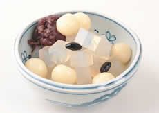 (1)取一淺缽,將適量寒天及白玉都置於缽內,舀入一匙紅豆泥,並灑上少許糖漬黑豆後,即可依個人喜好,淋上黑糖蜜或白糖蜜食用。 |