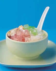 (1)將細冰放入碗中,再將其他材料排放在細冰上,上面淋上椰子奶、果糖等即可食用。 |