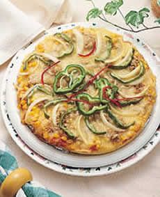 (3)熱鍋,塗少許奶油,放上麵皮,塗上一層蕃茄醬,再鋪上一層乳酪絲,加點玉米粒、鮪魚、洋蔥與青椒,最後再撒上一層乳酪絲,蓋上鍋蓋,開中小火烤約5分鐘後,轉小火,繼續烤10分鐘即可。