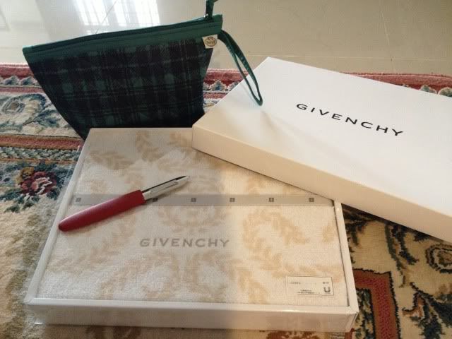 每买上100就送rm5 voucher, 我们一共有605就拿了30voucher,然后买上500就送zwillings hackel的peeler&knife set, 后来我走下走下又看到有个小桌子写着在home department买上400送一盒毛巾就又顺手拿了。送毛巾的安第又和我说买上300门口有naraya包包送,结果又顺手拿埋。虽然包包颜色不是很开胃但是有一大一小,赠品就别嫌弃了。和小蜻蜓分猪头后这些是我的。