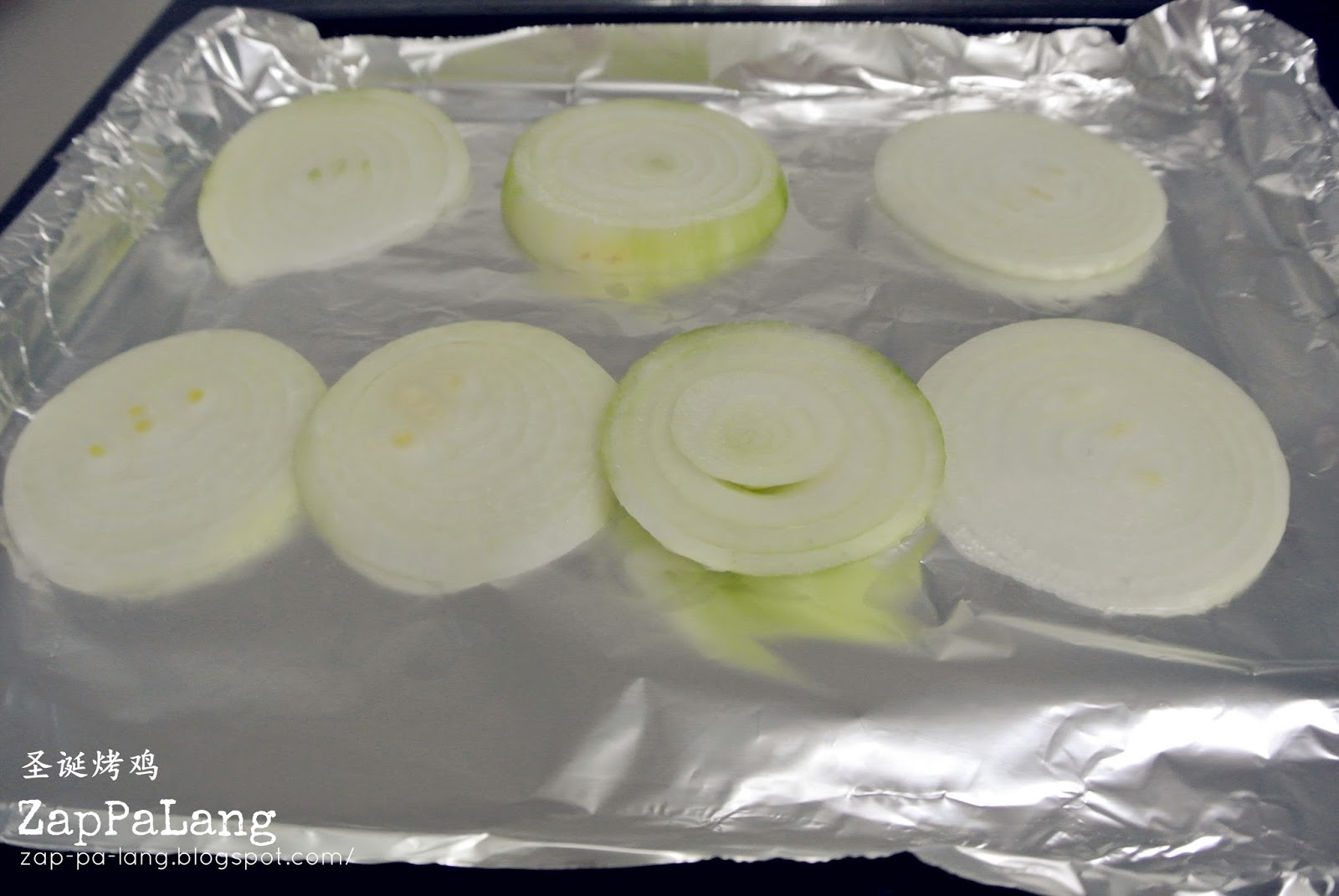 2。洋葱去皮, 切成片状铺在烤盘上。