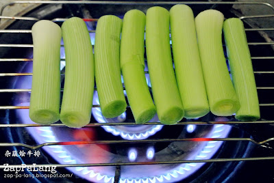 4。大蒜切段,在炉火上放个铁架,直火把大蒜表面烤黑。