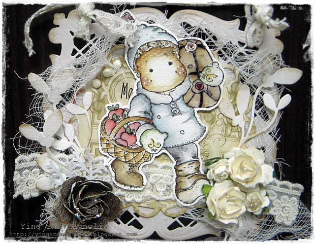 用了Magnolia新出的印章系列-Little Christmas 里的两只bears 印章,还有Magnolia的 patterned papers, dies cut