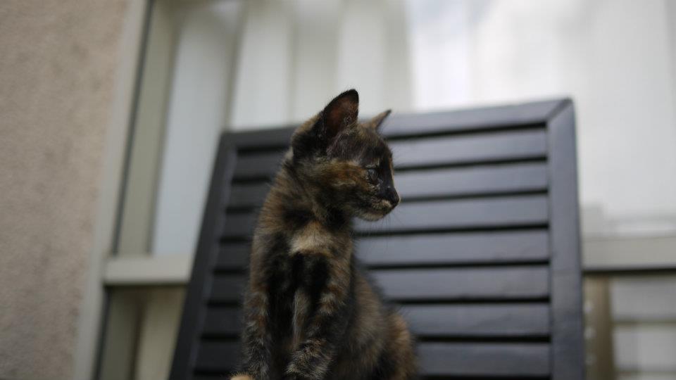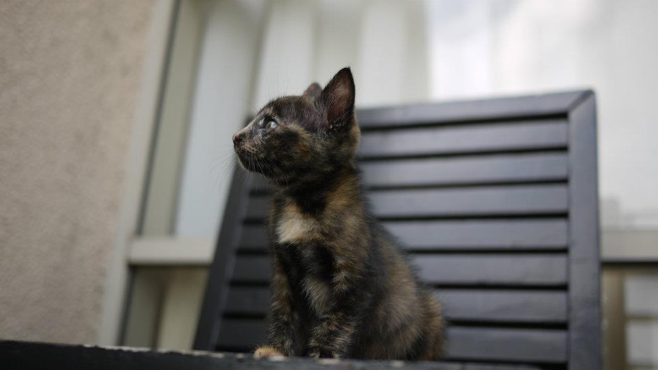 2012.1012放工的时候驾车经过看到它在大马路中间过马路,路上车过好危险.后来想如果跟朋友拿了东西倒回去看看还在的话把它带回家先,结果它还在,躲在路的divider树下,我停下车把它抱上车,它很好动,不怕陌生人,也很爱撒娇.